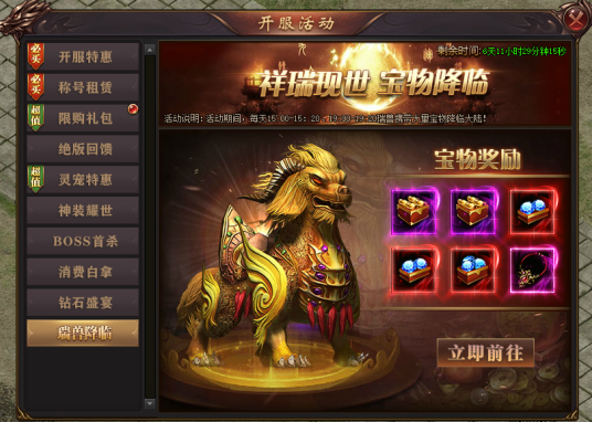 活动说明:活动期间,每天15:00、19:00,瑞兽携带大量宝物降临,参加击杀即可获得极品奖励!