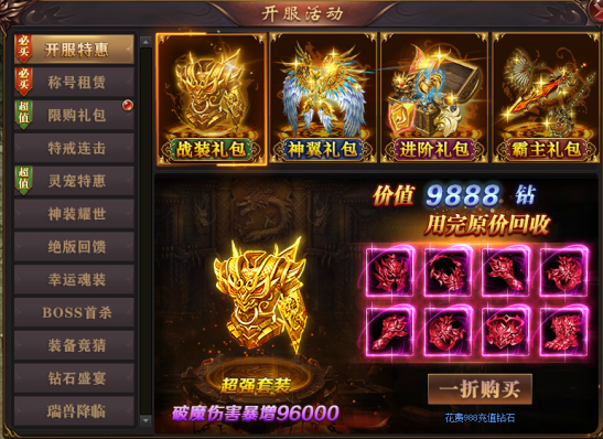 活动说明:活动期间,可以一折购买极品礼包以及各种稀有道具,极速提升实力!