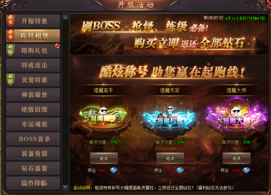 活动说明:活动期间,租赁限时炫酷称号,唤灵伤害瞬间飙升,并且购买后立即返还全部钻石