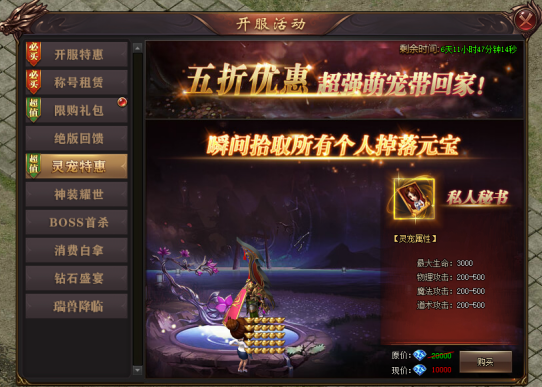 活动说明:活动期间,可5折购买超强灵宠“私人秘书”,瞬间拾取所有个人掉落元宝,解放你的双手!