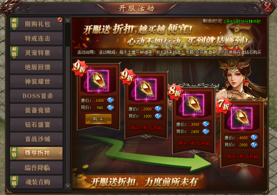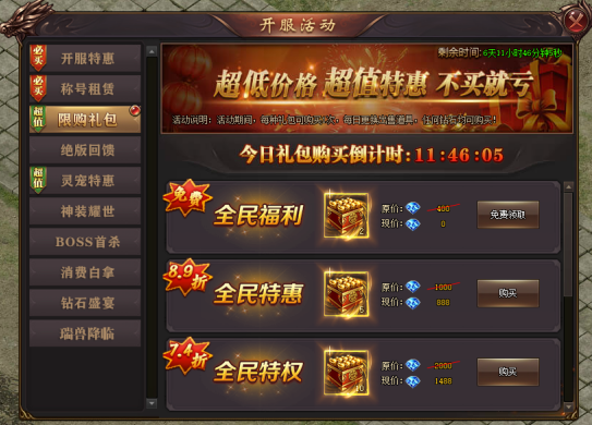 活动说明:活动期间,可限量购买折扣礼包,达到指定特权等级可购买更加超值专属折扣礼包,机会只限当天,开服冲榜必备!