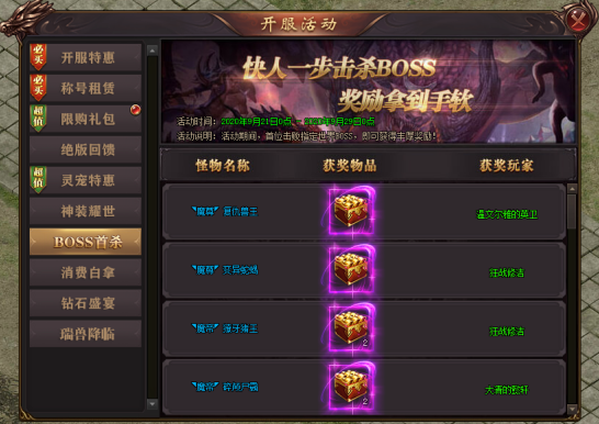 活动说明:活动期间,首位击败指定世界BOSS,即可获得丰厚奖励!