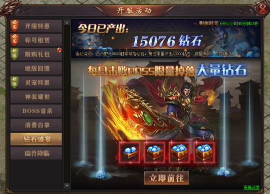 活动说明:活动期间,击杀任意BOSS即可掉落钻石,更有大额钻石限量掉落,时间就是钻石,绝对不可错过!