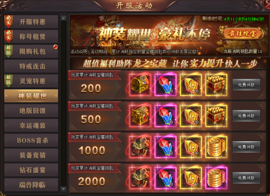 活动说明:活动期间,玩家累计消耗宝藏钥匙达到指定数量,即可额外领取高阶战装、神装自选箱奖励!