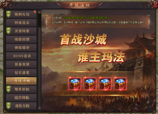 活动说明:活动期间,首次占领沙城的帮会将会获得钻石奖励!