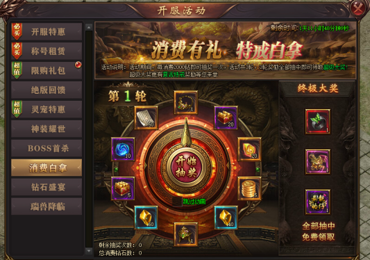 活动说明:活动期间,每消费2000钻石即可抽奖,每轮奖励全部抽中即可领取超级大奖!炫酷称号,复活特戒等你来拿!