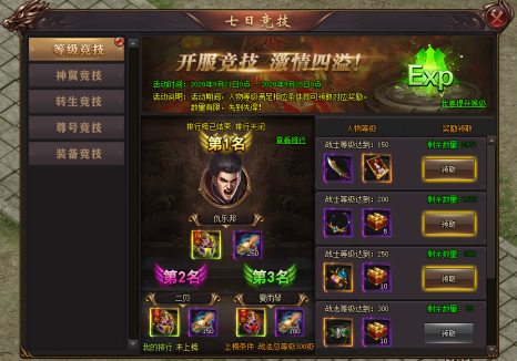 活动说明:活动期间,人物总等级满足相应条件即可领取对应奖励,数量有限,当天排名前3更可获得高阶传世装备奖励!
