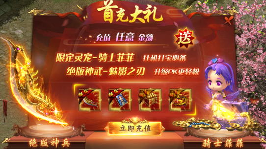 活动说明:充值任意金额,可获得限定灵宠、绝版神武,更有海量元宝和稀有道具相送!