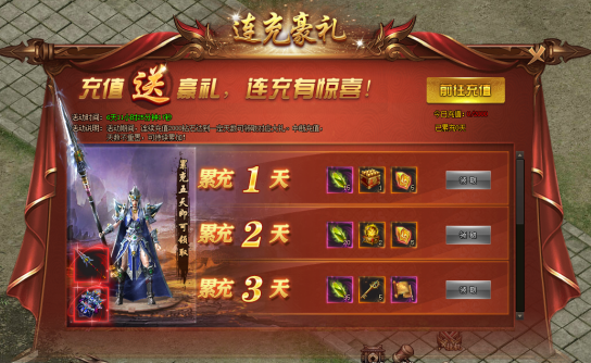 活动说明:活动期间,连续充值2000钻石达到一定天数即可领取对应大礼。中断充值,天数不重置,累充5天更有绝版时装奖励!