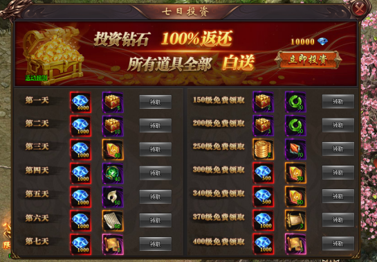 活动说明:活动期间,投资钻石后,钻石100%返还,所有道具全部白送!