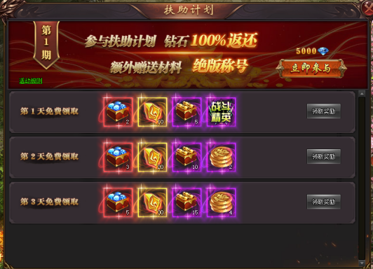 活动说明:参与扶助计划,钻石100%返还,额外赠送大量材料,更有绝版称号相送!