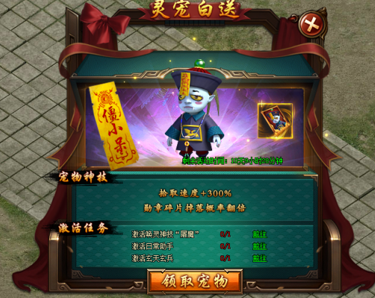 活动说明:活动期间,达成目标即可免费领取特殊灵宠,可光速拾取掉落道具、且使勋章碎片掉落概率翻倍,前期打怪效率、成长速度快人一等!