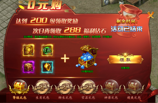 活动说明:活动期间,人物转生总等级满足相应条件即可领取对应奖励,数量有限,当天排名前3更可获得高阶传世装备奖励!