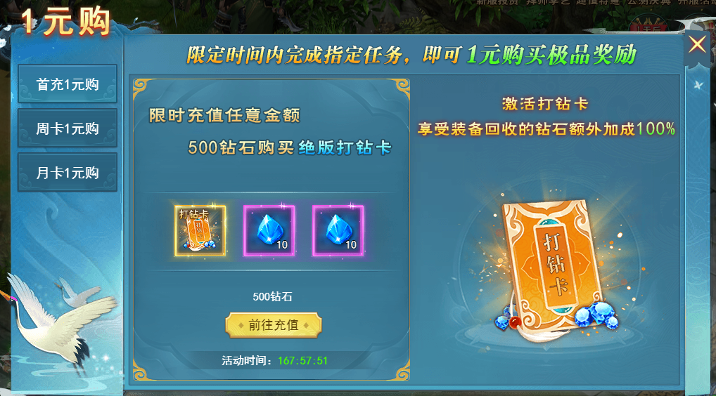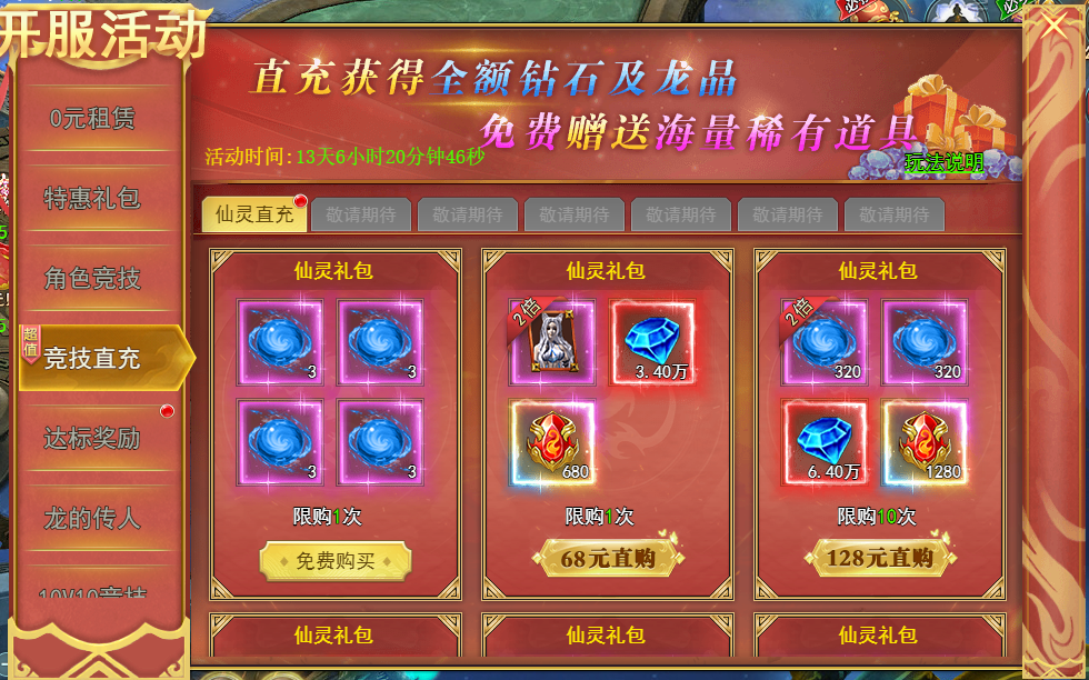 活动说明:活动期间,直充获得全额钻石及龙晶,免费赠送海量稀有道具。
