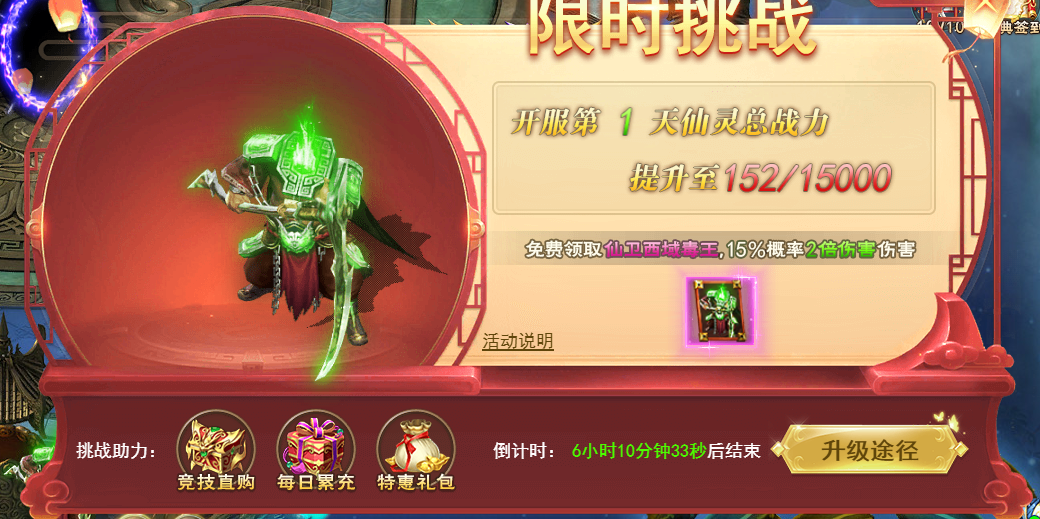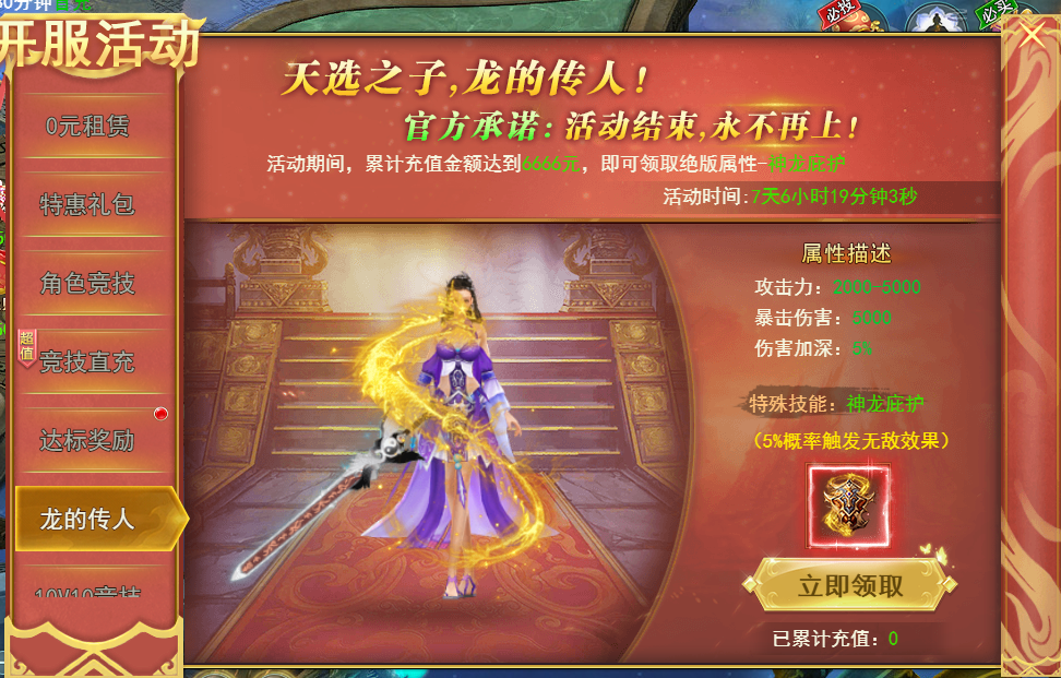 活动说明:活动期间,累计充值达到6666元,即可领取绝版属性-神龙庇护。