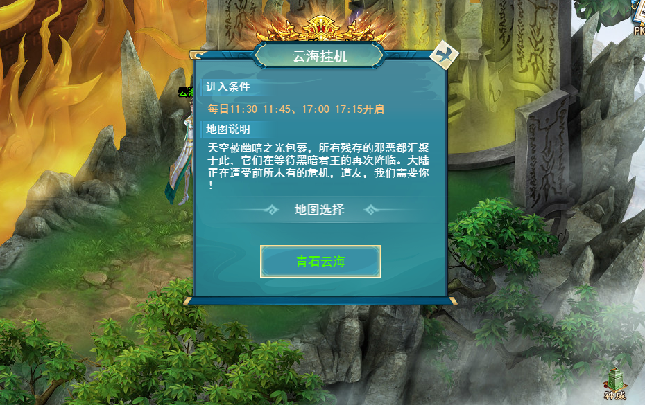 活动开启时,玩家可以通过仙王大陆云海挂机NPC进入云海挂机地图。