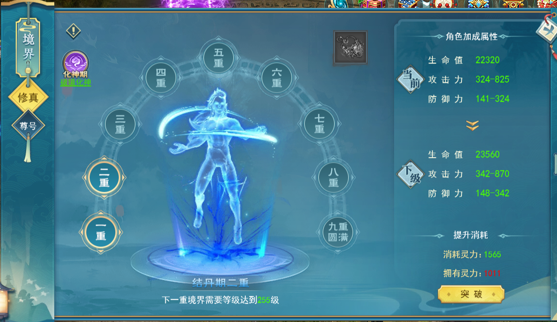 提升境界-修真系统可加成角色基础属性,系统阶段越高,属性加成越高。