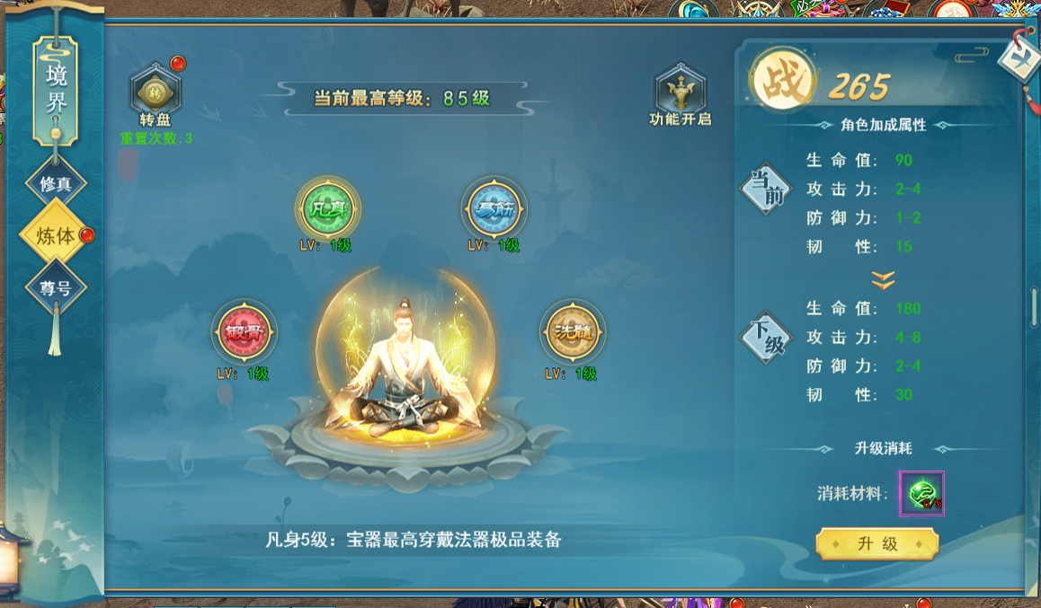 4大部位的炼体升级可以提升战装的穿戴上限、强化、精炼、宝石镶嵌、觉醒的等级。