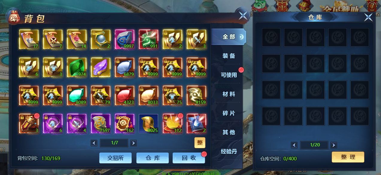 1) 全部》装备》可使用》材料》碎片》其他》经验丹