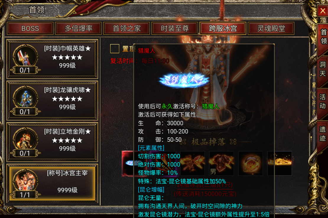 1、击杀有几率掉落绝版称号-猎魔人,可大幅提升法宝-昆仑镜的加成。