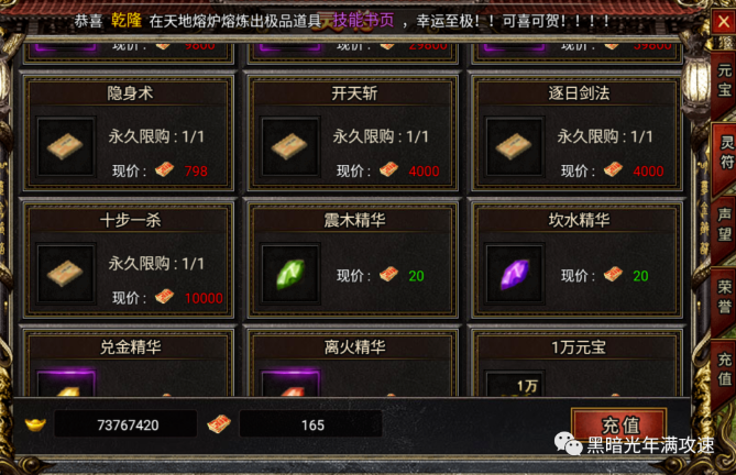 1.在灵符商城中,大家可以看到四项技能,包括隐身术、开天斩、逐日剑法、十步一杀,大家可以直接在灵符商城使用灵符获得,追求性价比的朋友,推荐获取三个技能就可以了,因为隐身术的作用并不大。