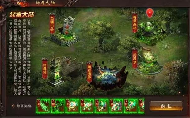 绿毒封魔录是单人地图,玩家在绿毒值达到标准后即可进入。封魔录分为绿毒魔王和绿毒魔帝: