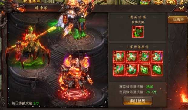 绿毒塔是玩家个人挑战地图,每层都有守护者,击败守护者即可通关并获得奖励。挑战绿毒塔需要一定的绿毒抵抗值,抵抗值不足会被击败。目前绿毒塔最高200层,每层对绿毒抗性要求不同。