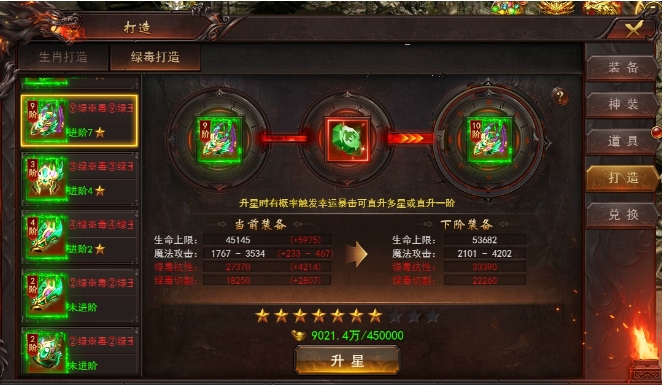 升星:提升绿毒装备的属性,每阶装备有10星,升满10星自动进阶。武器和衣服升星消耗绿毒宝钻,其他部位消耗绿毒水晶。
