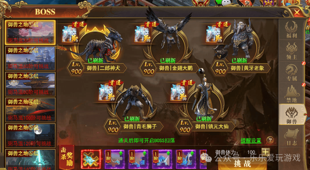 2.每击杀一个B0SS扣除一定的御兽体力,每天默认100点,零点重置。
