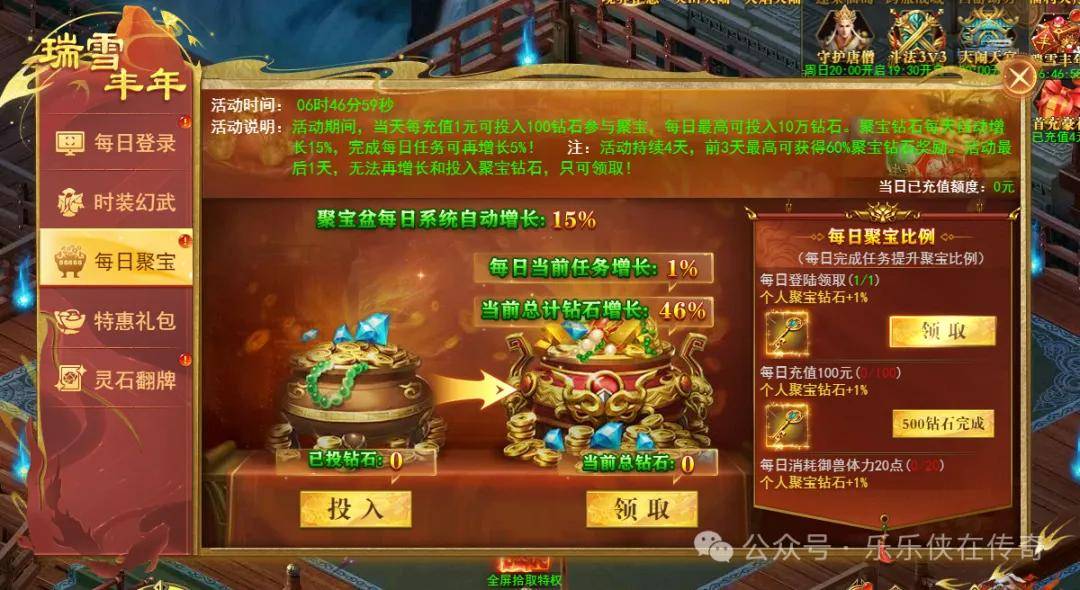 开天西游折扣包服重回西游每日聚宝活动期间,当天每充值1元可投入100钻石参与聚宝,每日最高可投入10万钻石。聚宝钻石每天自动增长15%,完成每日任务可再增长5%!注:活动持续4天,前3天最高可获得60%聚宝钻石奖励。,活动最后1天,无法再增长和投入聚宝钻石,只可领取!