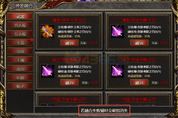 吸血属性的武器和项链爆率极低,融合时应将带吸血属性的装备作为主材,其他属性装备作为辅材,以防融合失败主材保留。