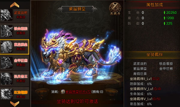 3. 坐骑可以消耗坐骑进阶丹进行升级,提升等级可获得大量属性。坐骑进阶丹可以通过修罗天界获得。