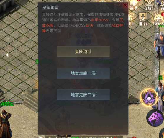 皇陵地宫中有剑甲BOSS,专门爆武器和衣服,但BOSS具有反伤效果。一层的BOSS反伤能力不是很强,佩戴吸血神器后可以挑战;二层的反伤能力较强,不仅需要吸血装备,最好和道士打配合。