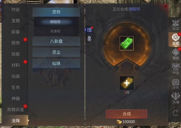 此外,法阵系统中还有四个特殊的装备:法阵灵符、法阵八卦盘、法阵灵尘和法阵仙珠。这些装备不仅单项属性强大,而且当四件装备全部佩戴时,还能激活特殊的套装属性,如让对方在攻击时无法跑步,持续数秒。这种控制效果在PK中极具优势。