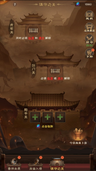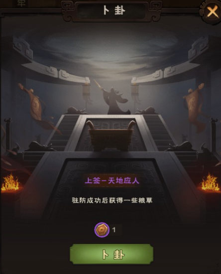 在镇守边关的过程中,主公们需要各自选派3位英雄分别镇守阳平关、剑门关和虎牢关。这些英雄将在驻防九个小时后,为主公们带来百炼石等丰厚奖励。不过,在镇守之前,主公们还可以进行卜卦。卜卦可以随机产生不同效果,比如获得额外的粮草、木材等资源,或者获得掠夺加成、战力提升、产量提升等不同效果。而卜卦令的获取,则需要依靠科研院的卜卦科技。因此,主公们在游戏初期,一定要重视科研院的发展,以便能够获取更多的卜卦令,从而在镇守边关时获得更多的优势。