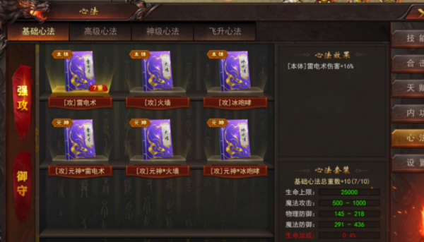 那么,如何升级心法呢?升级心法需要消耗成品心法,这些都可以在游戏中获取。基础心法和高级心法还可以在战功商城购买,方便又快捷。随着心法的升级,你不仅能提升技能系数,还能增加基础属性,甚至获得百分比属性加成。这意味着,随着你的心法等级不断提升,你的整体实力也会呈几何级数增长!