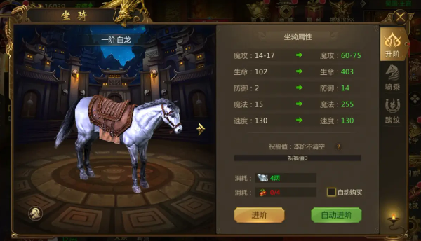 嗨,各位龙途勇士!想在主城骑上流光溢彩的高阶坐骑,却被"进阶失败"劝退?想一口气冲到15阶,却不知道到底要囤多少果实?今天这篇干货,直接把每一阶的"精确果实消耗+祝福值机制"给你拉个明白表——看完再冲阶,绝不浪费一颗果子!