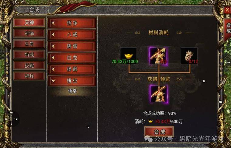 想要获得天神装备,可通过合成获取。需要两样关键材料:“天神碎片”和 “封神令”。
