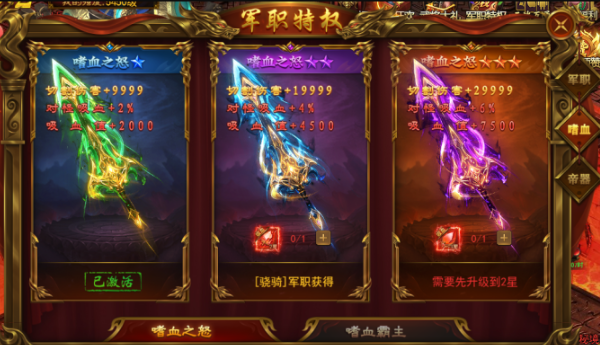 轻骑之上的军职档位,核心奖励变为【嗜血升阶石】,用于提升嗜血之怒的星级。星级越高,属性加成越夸张。建议有能力就逐级解锁,把嗜血之怒堆到高星,这是贯穿前中后期的核心装备。