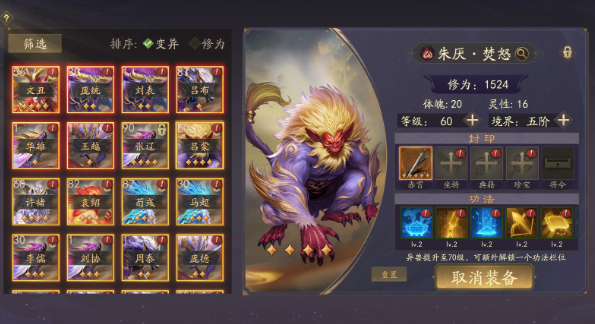 特殊兵种火牛南蛮巫,不拖回合可换但暂时无替代。副将太史慈王允。异兽四星焚怒金色优于蓝色——蓝色火烧不可格挡和受伤增30%对吕蒙固定值百分比伤害鸡肋,金色增焚烧伤害两回合火烧远战首回合加怒气更配合。封印赤驹封第五词条,抽满即毕业。