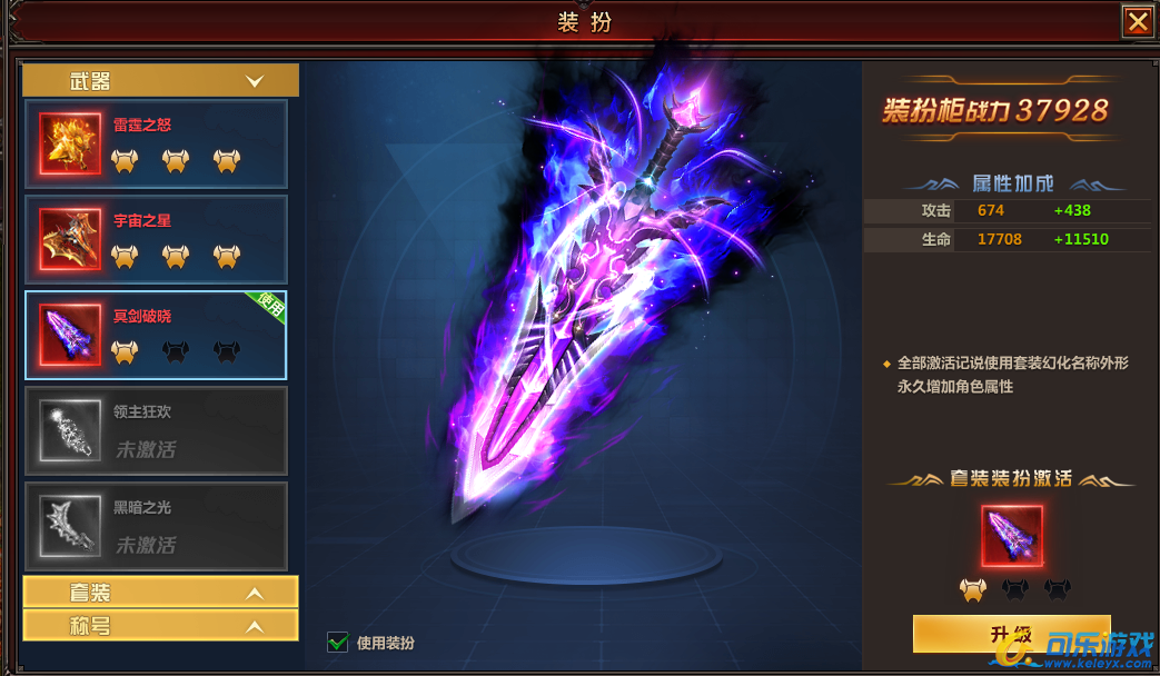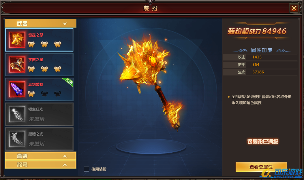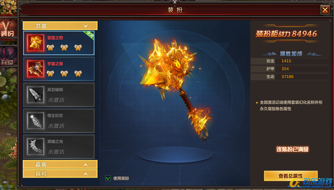 Ø 武器装扮:武器装扮中共有5种武器装扮,分别为:雷霆之怒、宇宙之星、冥剑破晓、领主狂欢、黑暗之光。每一种武器装扮的外显都不同,获得的属性也不同。所有武器共需要3次激活才可以激活至满级,激活1次后即可获得武器外显效果,每次成功幻化后获得的属性可以为角色永久增加。已经全部激活3次的武器外显会获得3次激活属性加成,装扮面板中显示“该装扮已满级”,面板上显示的黄色亮点为激活次数,激活3次满级的武器显示的黄色亮点为3个,可以在面板中点击“查看总属性”查看武器为角色增加的属性,点击“使用装扮”即可为角色替换上该武器的外显效果。