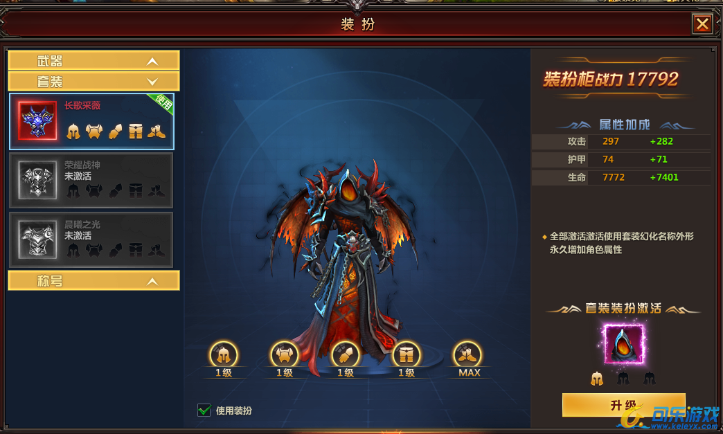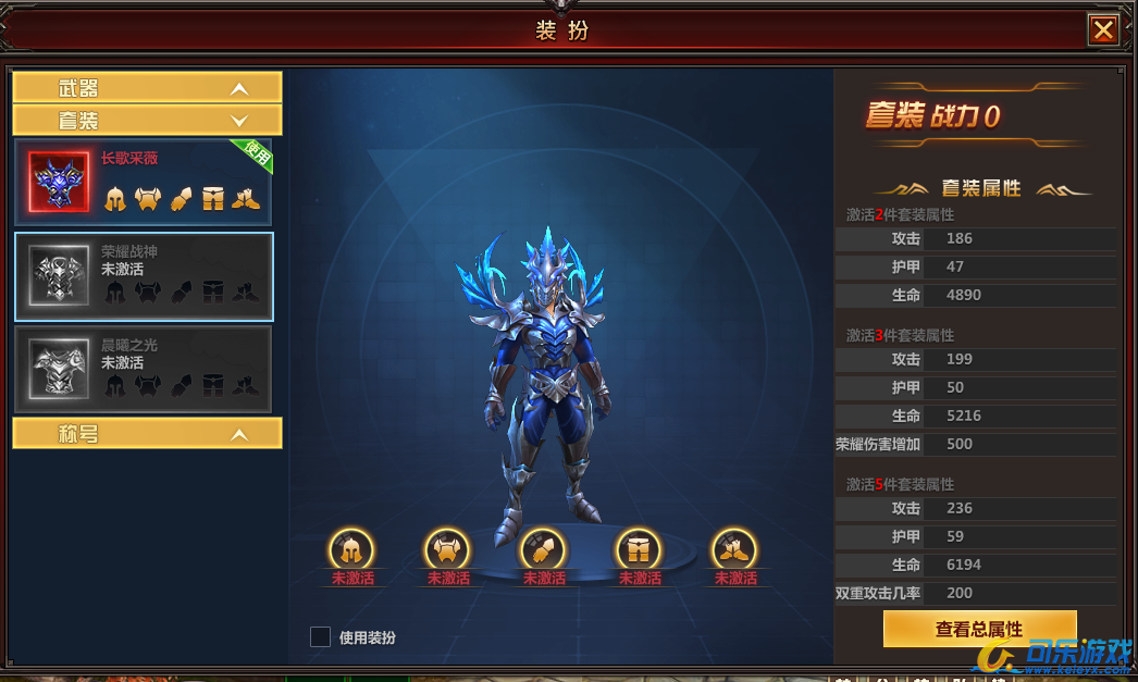 Ø 套装装扮:装扮系统中的套装装扮共有3件,分别为,长歌采薇、荣耀战神、晨曦之光。每件套装中共有5个部位:头盔、护甲、手套、裤子、鞋子。集齐5件相同套装的不同部位即可将套装全部激活、套装激活效果分为2件套、3件套、5件套。每个套装的3件套与5件套的激活效果都不相同,同时会带有额外的属性加成。套装只有集齐5个部件才可以使用套装外显,每个部位分为3级,获得相同套装的相同部位后可以升级改部位,3级满级后,面板上的部位会显示为“MAX”。