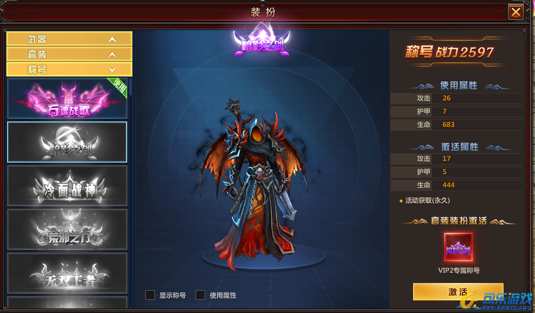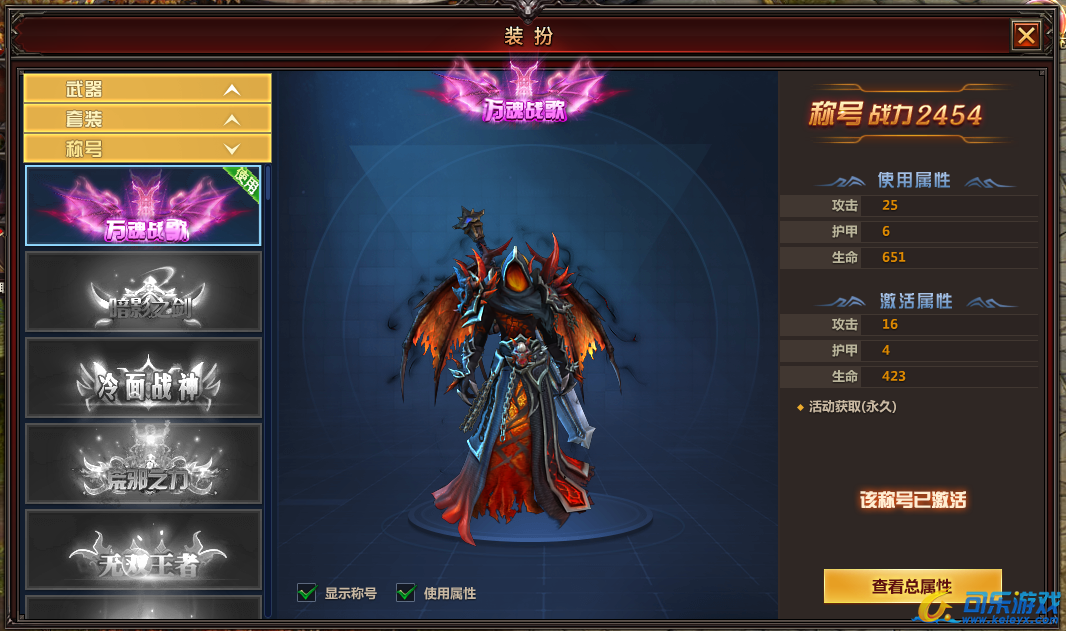 Ø 称号装扮:装扮系统中的称号装扮共有26个称号装扮。与武器装扮和套装装扮不同的,武器和套装已激活的装扮,战力与属性会永久叠加,称号装扮分为使用属性与激活属性两种。激活的称号都可以将激活属性叠加,但是使用属性只可以选择一个称号,每个称号的使用属性都不相同。已经激活的称号可以在面板中选择显示称号,即可在主界面角色头上显示已经选择的称号,点击已经激活的称号的使用属性,可以获得该称号的属性。