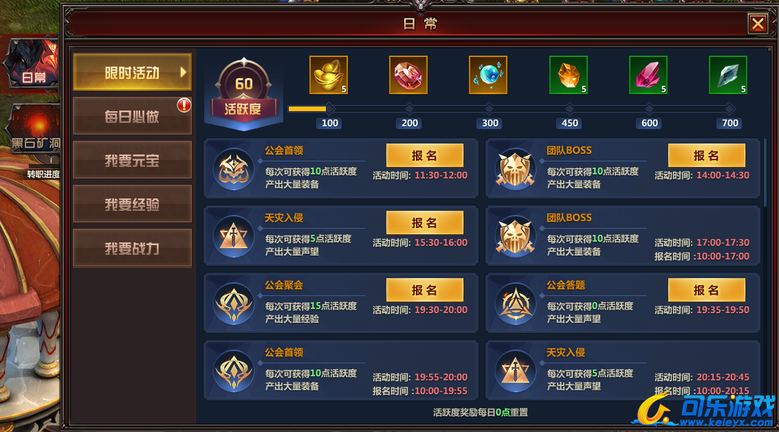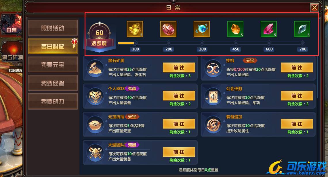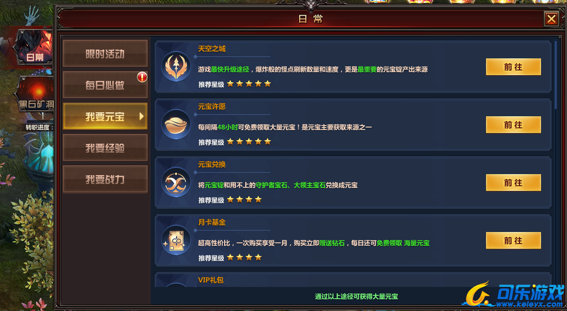 主要有:限时活动、每日必做、我要元宝、我要经验、我要战力、黑石矿洞