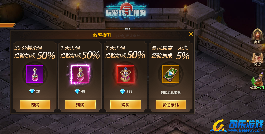 效率:可使用钻石购买经验药水,不同的经验药水使用后,杀怪经验不同,玩家可根据需要进行购买。也可以参与赞助豪礼活动,可获得永久经验加成