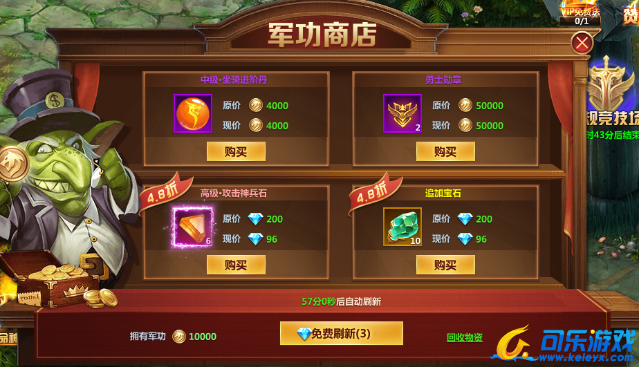 Ø 军功商店系统:分解后的装备可在军功商店主界面进行道具兑换。军功商店每1小时可刷新不同的4个可兑换道具,其中高级物品会进行打折,可以将军功商店中的兑换物品进行免费5次刷新,刷新次数耗尽后,需要使用钻石进行刷新。其中,高级物品需要用钻石兑换。