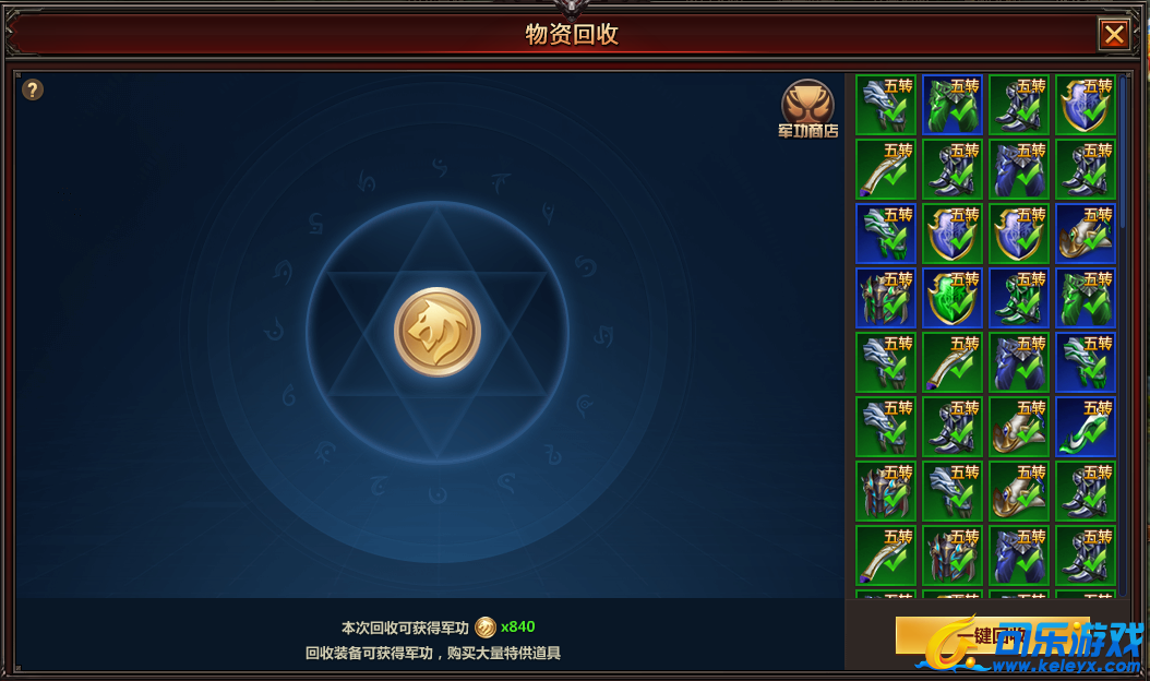 Ø 军功回收系统可将主线任务和副本奖励获得的低级蓝装、绿装进行回收分解,回收的装备不可找回,低级装备成功回收后可以获得军功金币,军功金币可以兑换大量物资及稀有道具。