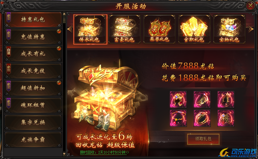 说明:开服第一天即可购买。包含六件传承装备,低等级穿戴限制与高属性,让您PK打宝更爽快!传承装备更是成长型装备,最高可进化至6转!(进阶至6后更可回收成龙钻,超级保值!)
