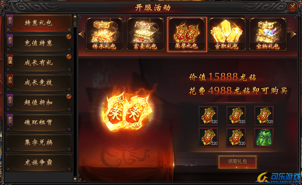 说明:开服第一天即可购买。购买礼包即可获得荣誉大礼包,荣誉商城稀有道具任意买,更可升官印,获得PK百分比增伤!