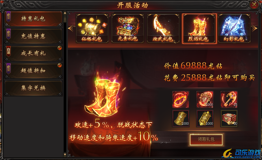 说明:开服第三天即可购买。购买可得“炼狱红莲”足迹特效,生命获得大量提升,攻速猛增5%,脱战状态更可增加10%移动速度!